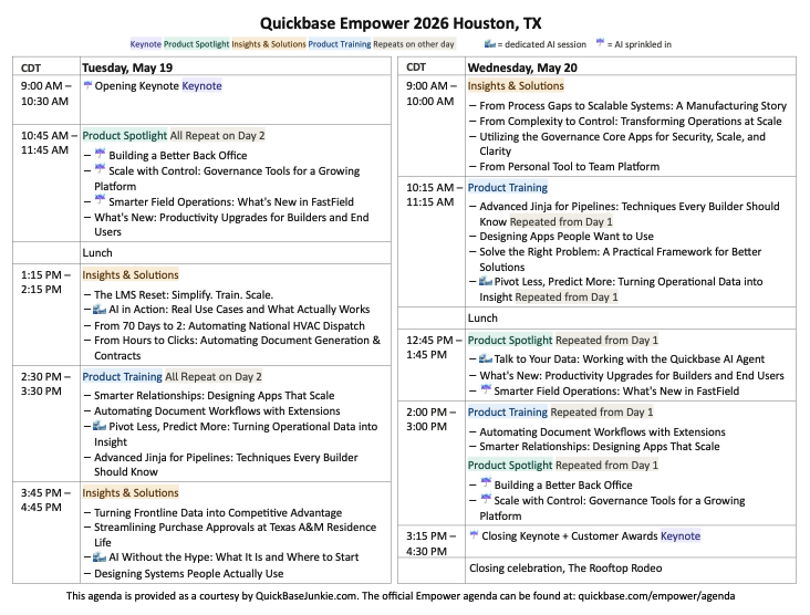 When I look at the agenda for Quickbase's Empower 2026 event in Houston, my first reaction is excitement (followed by a little bit of overwhelm π€ͺ). There's a lot happening around AI in particular, and as someone who lives and breathes Quickbase, I want to see where it's headed.